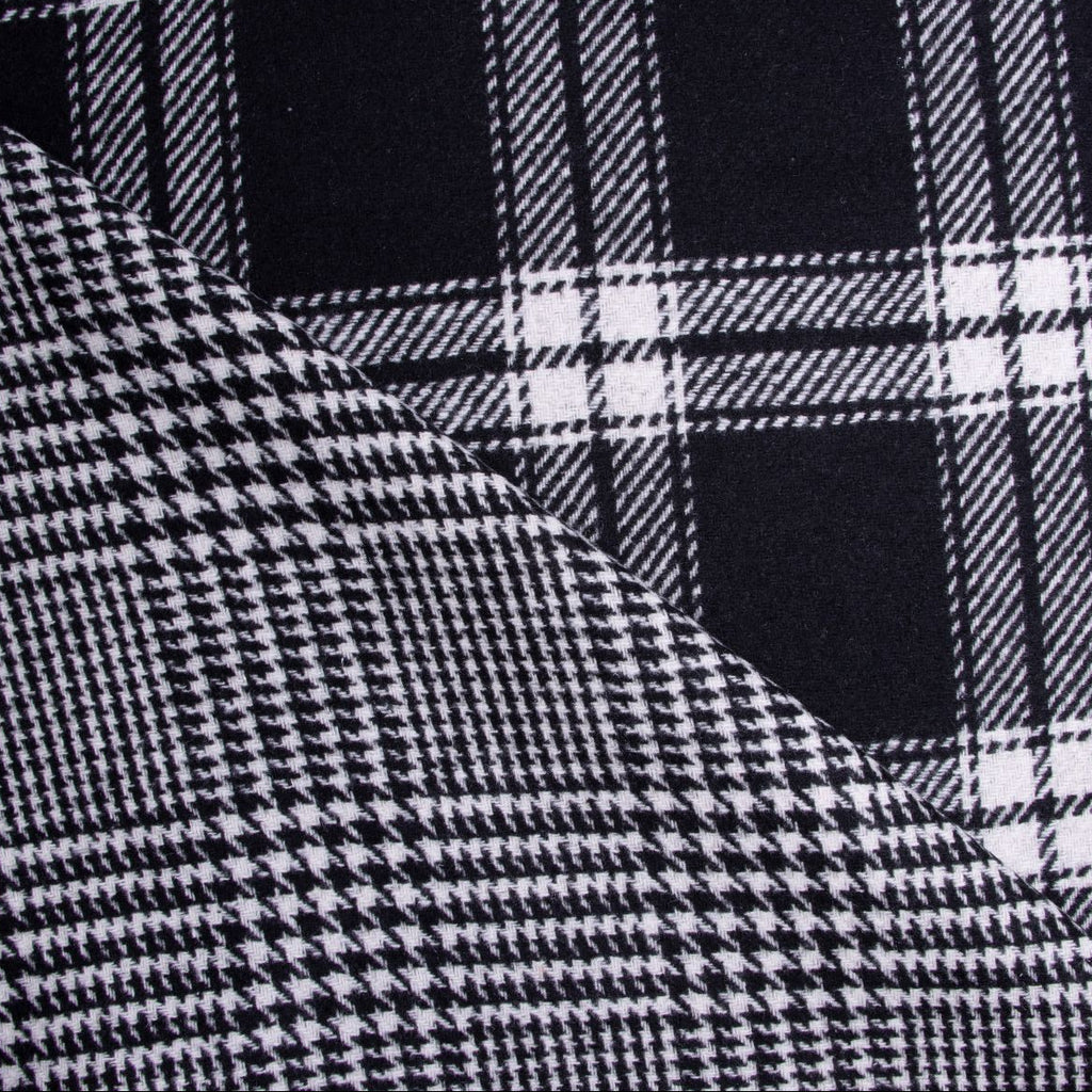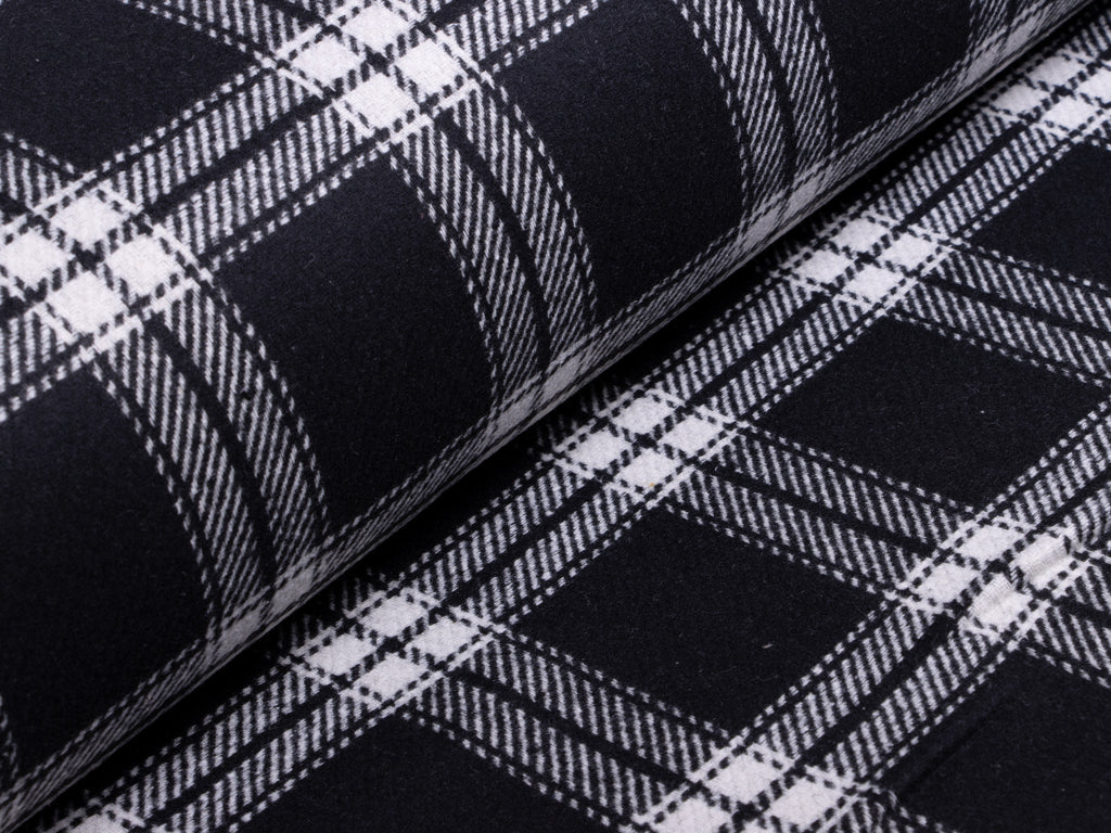Der Wollstoff ist ein Doubleface, das Hahnentrittmuster ist auf einer Seite klein und auf der anderen ist ein Karomuster dargestellt. Super für Jacken und Ponchos.